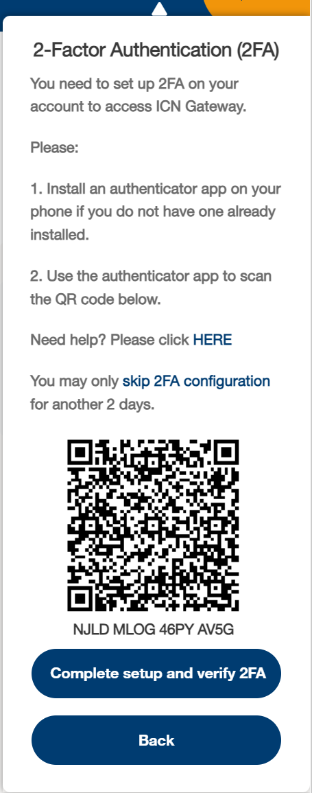 The authenticator application generates a six-digit code, which changes every 30 seconds, for you to enter when you log in. Being synchronised with our servers, this code verifies that your login credentials are being used by you only. You will need to use the authenticator application to verify yourself whenever you log in to Gateway by ICN, other ICN applications or ICN websites.
